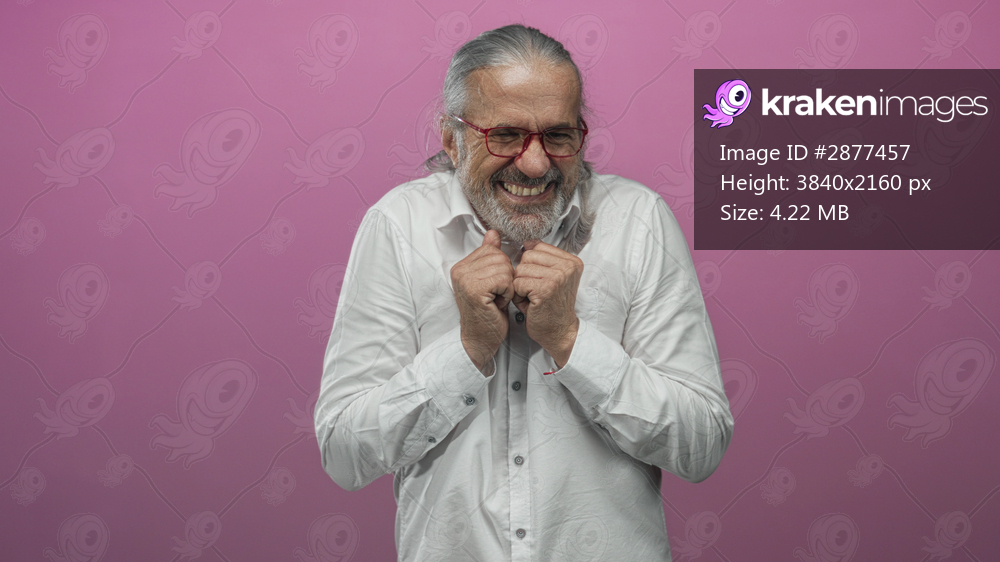 Man with long gray hair and red glasses grinning and clutching fists in studio against a pink backdrop; joyful anticipation.