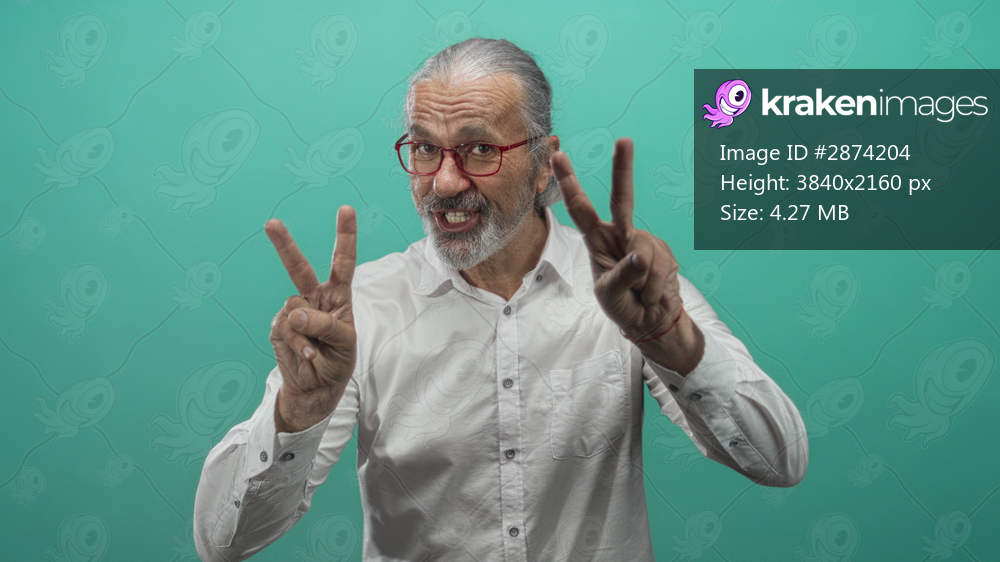 Man with long gray hair and red glasses wearing white shirt showing peace sign with both hands in studio teal backdrop; playful confidence.