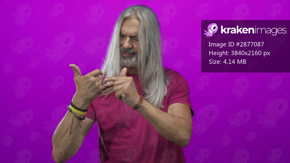 Man with long gray hair showing hand gesture and pointing fingers in studio with vivid magenta background; pensive reflection.