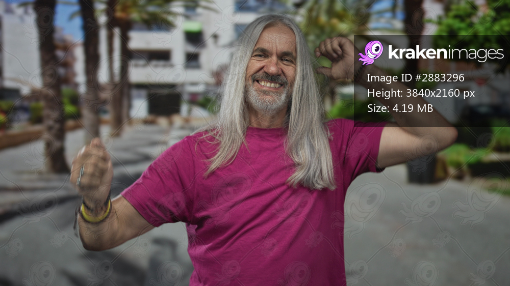 Man with long gray hair smiling and raising fists in celebration on street lined with palms; joy celebration.
