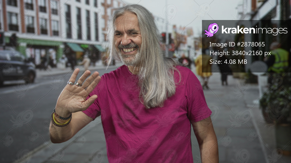 Man with long gray hair waves hand on busy city street while smiling and wearing pink shirt; warmth welcome connection.