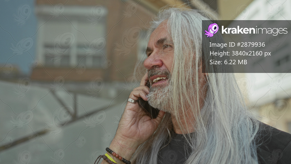 Man with long grey hair and beard holding phone to ear on urban street with parked cars and buildings; contentment connection.
