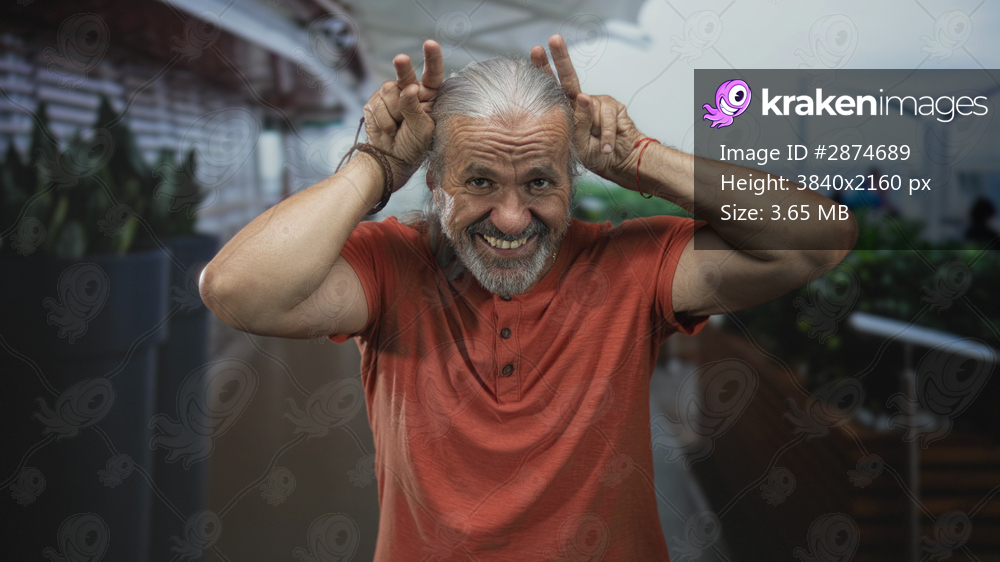 Man with long grey hair and beard makes rabbit ears with fingers behind his head at airport terminal; playful mischief.