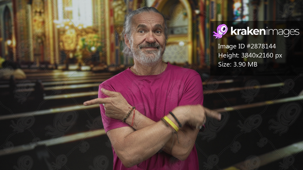 Man with long grey hair and beard points finger while arms crossed inside church building ornate nave; playful reflection.