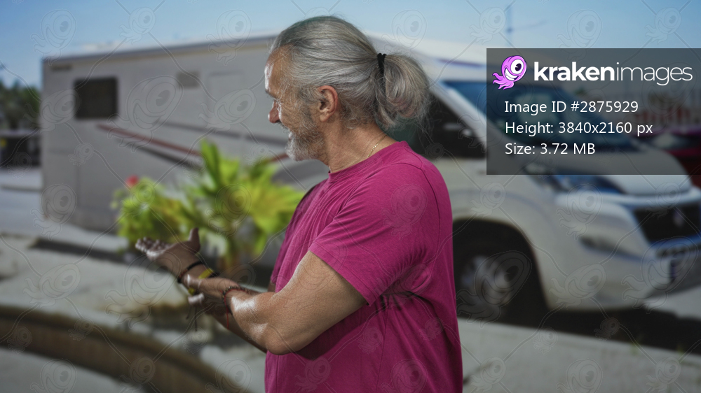Man with long grey hair gestures with open hands on a sunny street beside a camper van; road travel contentment.