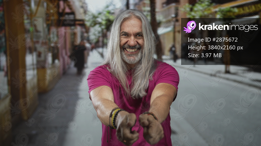 Man with long grey hair smiling and pointing both hands at camera on a city street; confidence and joy.