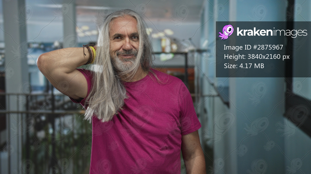 Man with long grey hair touching his hair in a building corridor wearing a magenta shirt and bracelets; contentment.