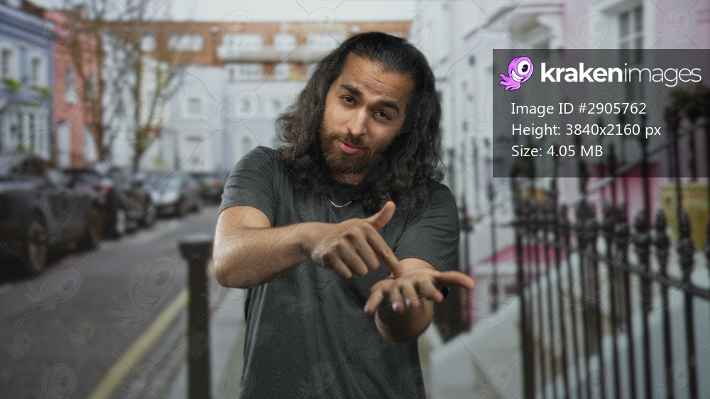 Man with long hair and beard beckoning with both hands on a narrow city street lined with parked cars and iron railings; pleading for help.