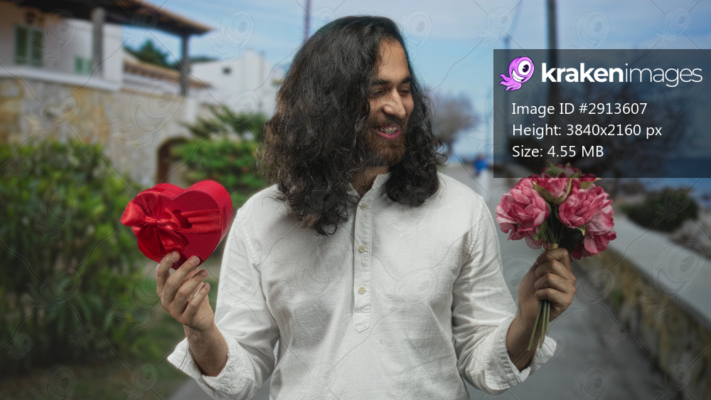 Man with long hair and beard holding a red heart box and pink bouquet on a coastal street, smiling and looking at the gift; romance surprise hope.