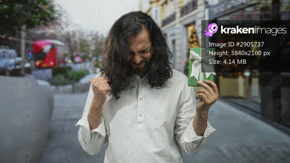 Man with long hair and beard holds green gift box in right hand while squinting and grimacing on a street near storefronts and decorated trees; holiday disappointment. - Kraken Images