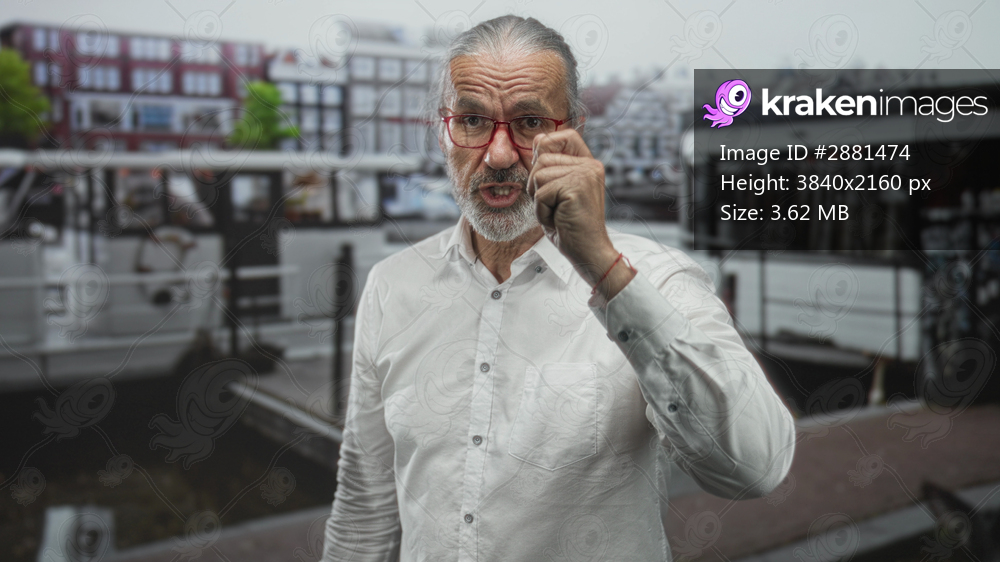 Man with long hair and beard points finger at camera on amsterdam canal street; determination warning.