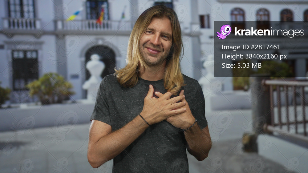 Man with long hair clasping chest on a sunny urban street lined with white buildings and green shrubs; gratitude thankfulness compassion serenity.