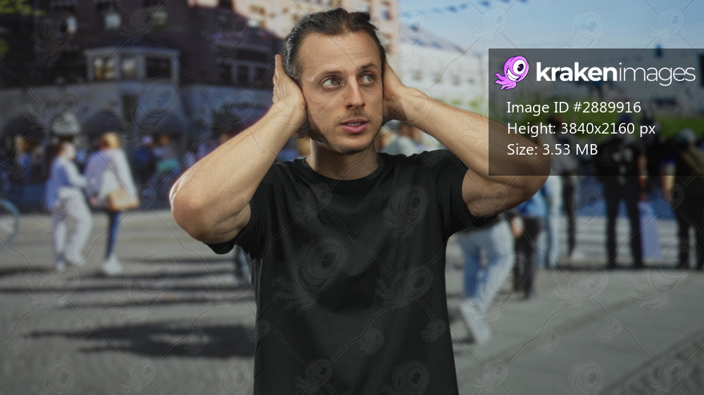 Man with long hair covers ears with both hands while standing amid a crowded city street crosswalk in daylight; urban frustration.