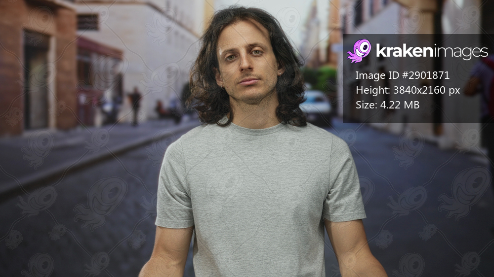 Man with long hair and earrings, arms at sides wearing gray tshirt standing on city street; calm introspection.