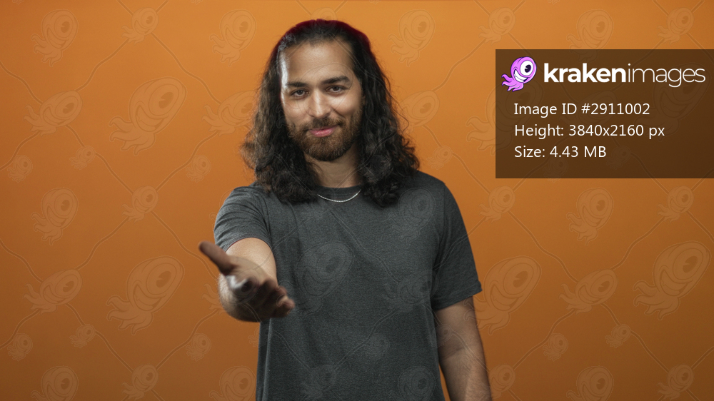 Man with long hair extending an open hand toward camera in orange studio, slight smile and relaxed posture; welcoming.