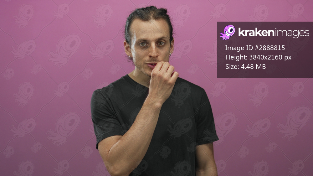 Man with long hair, finger to lips gesture and visible hand near mouth in pink studio setting; thoughtful introspection.
