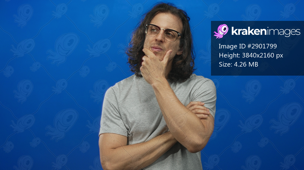 Man with long hair and glasses, hand on chin and arms crossed, wearing grey tshirt in studio against vivid cobalt blue wall; thoughtful.