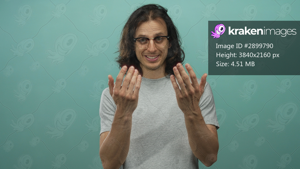 Man with long hair and glasses showing open palms in studio with teal wall, wearing gray t shirt and casual pose; welcoming curiosity.