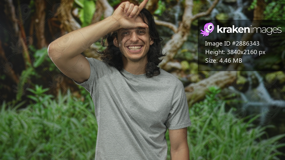 Man with long hair hand forming l on forehead smiling with tongue out and showing bare arm among green plants in forest setting; playful mischief.
