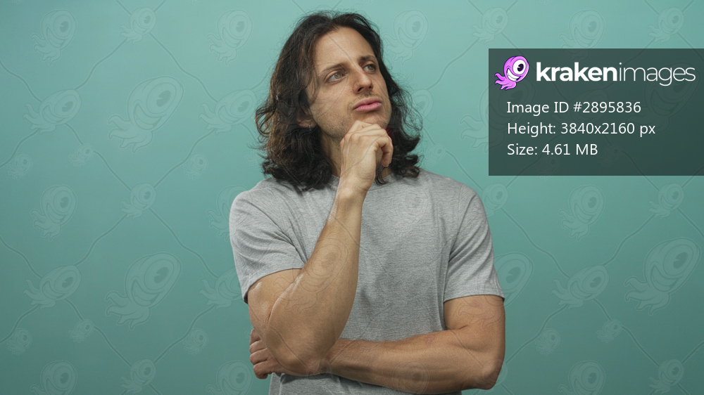 Man with long hair hand on chin in teal studio wearing gray t shirt, arms folded and contemplative pose; thoughtful reflection.