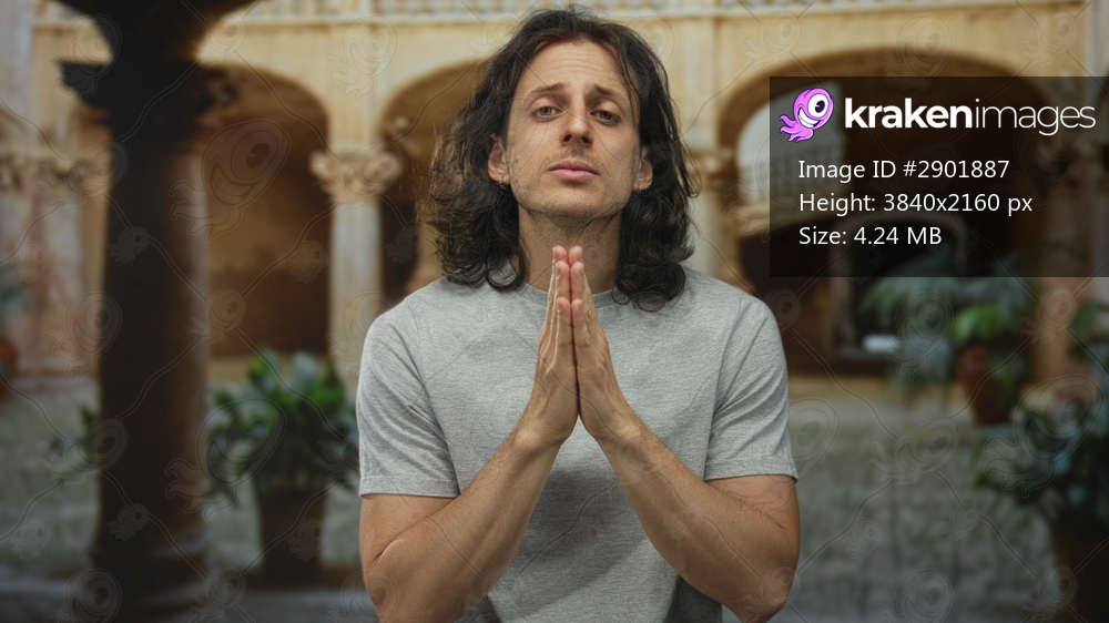 Man with long hair, hands clasped at chest, eyes closed in prayer before old town stone arches and columns of a building courtyard; introspection hope. - Kraken Images
