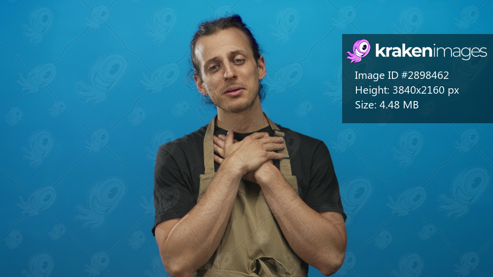 Man with long hair and hands crossed over chest wearing apron and black shirt in blue studio; gratitude sincerity.