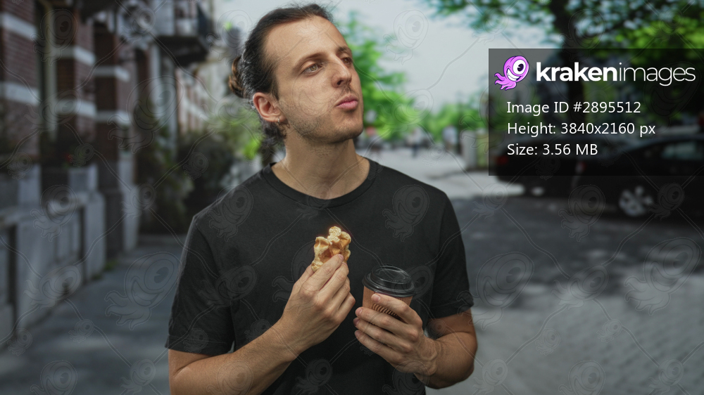 Man with long hair holding coffee cup and waffle, tongue out and chewing while standing on a city street by brick buildings; playful enjoyment.