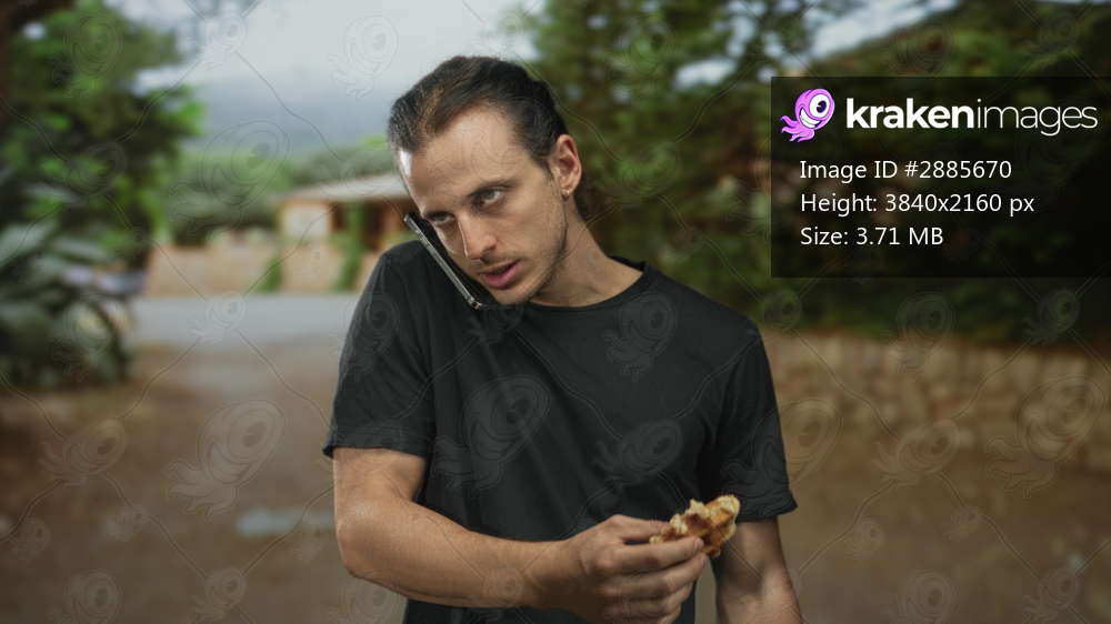 Man with long hair holds sandwich while cradling smartphone between ear and shoulder on old town street by a stone wall; focused multitasking.