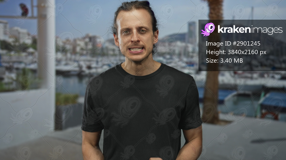 Man with long hair in black shirt clenches fists at marina pier, gritting teeth and leaning forward among moored boats and palm tree; anger resolve.