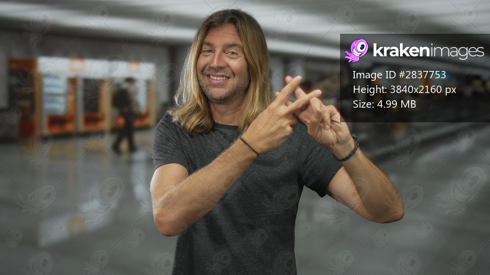 Man with long hair in dark grey shirt makes hashtag gesture with fingers at airport terminal; playful connection.