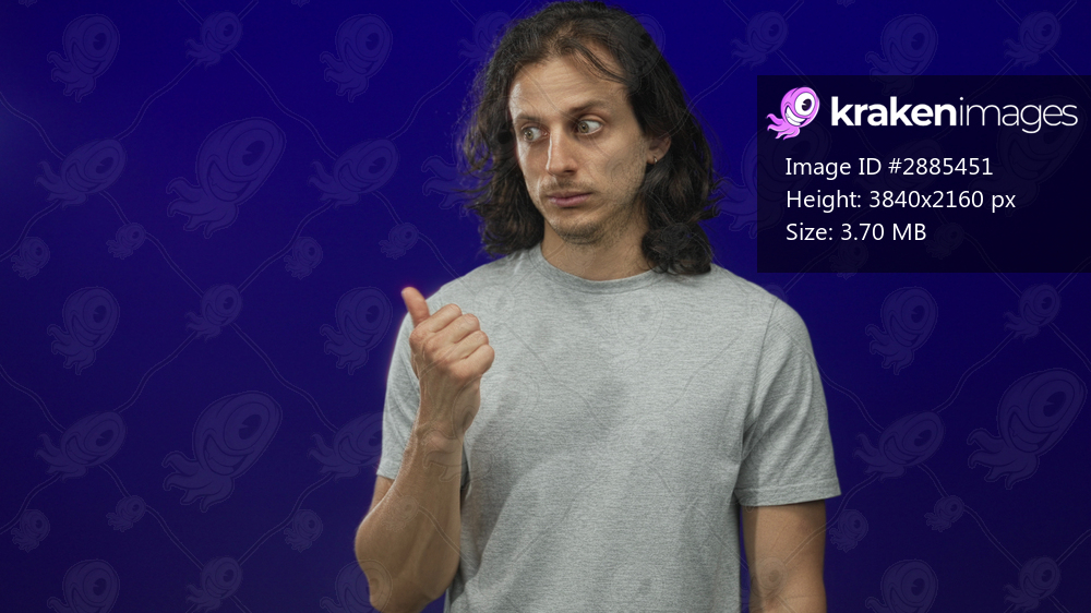 Man with long hair in gray t shirt showing thumb gesture and pointing to head in studio with deep blue background; thoughtful reflection.
