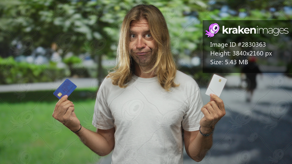 Man with long hair in white shirt holding two creditcards with visible chip in a green forest; financial hesitation.