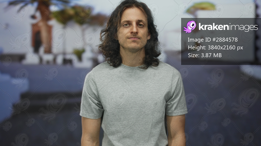 Man with long hair looking up on a street lined with white buildings and palm trees; quiet curiosity.
