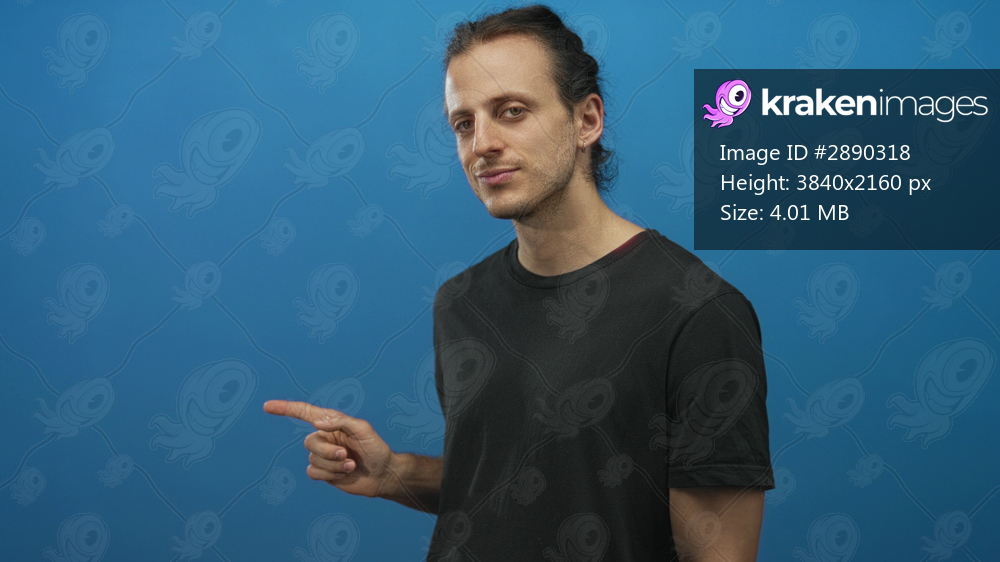 Man with long hair pointing finger and making phone gesture in studio with blue backdrop; playful invitation.