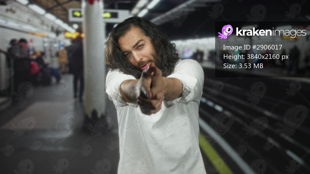 Man with long hair pointing hands like a finger gun on a crowded train platform inside building; playful bravado.