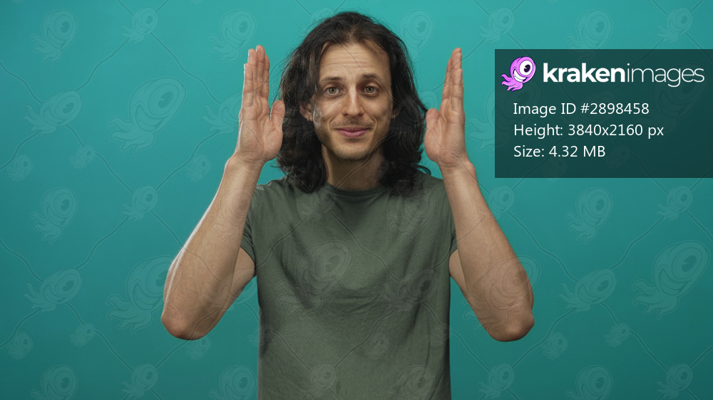 Man with long hair raising both hands beside face with palms visible and slight smile in teal studio; playful confidence.