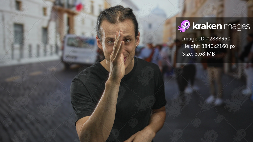 Man with long hair smiling, hands clasped, wearing a black t shirt and hoop earring on a street in a crowded city scene; joy travel.