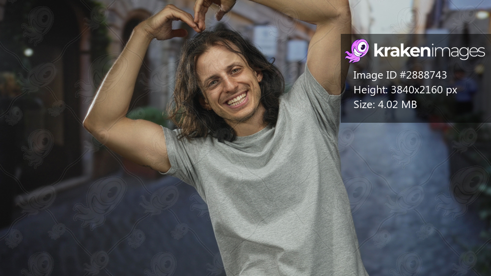 Man with long hair smiling and making heart hands gesture with raised arms on a cobblestone street by buildings; joy travel.