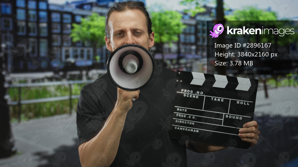 Man with long hair speaks into megaphone and holds clapperboard in hand on street by buildings and trees; protest urgent message.