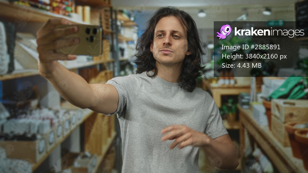 Man with long hair taking selfie holding smartphone and showing peace sign inside store interior decor shop with shelves and plants; playful.