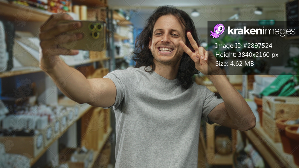 Man with long hair taking selfie holding smartphone and showing peace sign inside store interior decor shop with shelves and plants; playful.