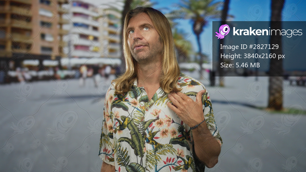 Man with long hair walking on promenade under bright sunlight by modern beachfront buildings; serenity.