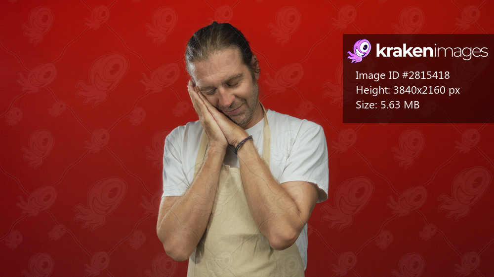 Man with long hair wearing a beige apron folds hands in prayer posture in a red studio setting; serenity.