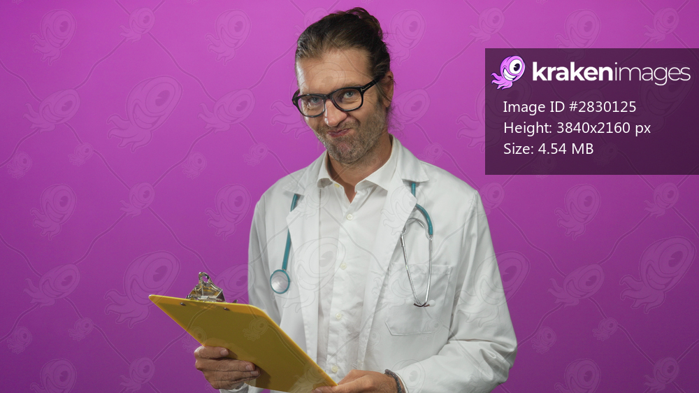 Man with long hair wearing glasses in white doctor uniform holds clipboard against purple studio wall; concentration.