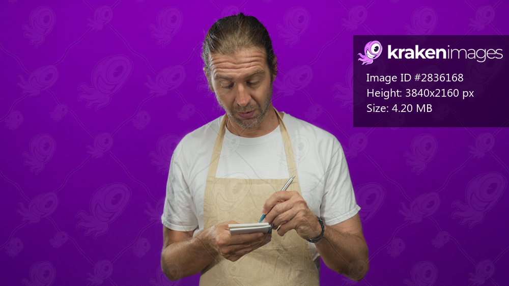 Man with long hair writing in notepad as he holds a pen and looks thoughtful in a purple studio; focus calm.