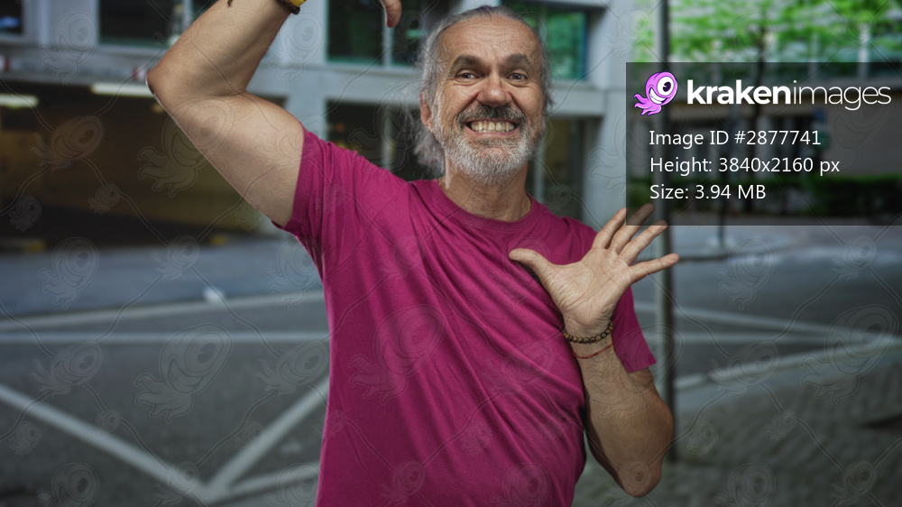 Man with long hoary hair and beard framing scene with hands and smiling on city street in magenta t shirt near building facade; joy.