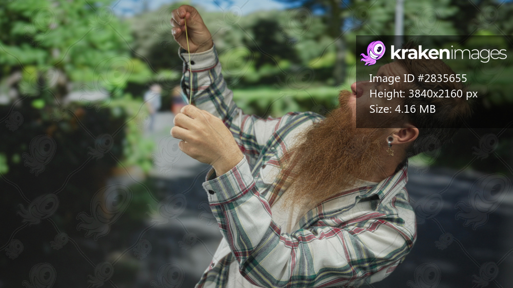 Man with long red beard extends yellow measuring tape along leafy street walkway under sunlight; precision.