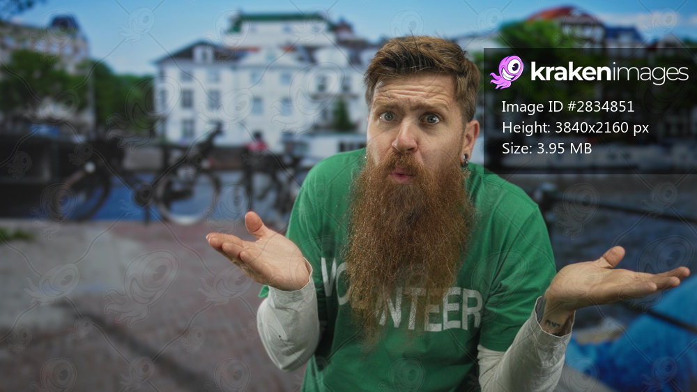 Man with long red beard wearing volunteer shirt raises fist on street by canal in urban city; solidarity support activism.