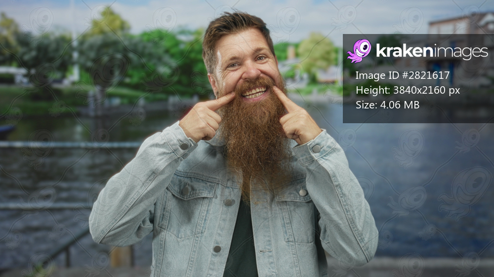Man with long reddish beard wearing denim jacket points finger to mouth on street overlooking river canal guardrail; happiness positivity.