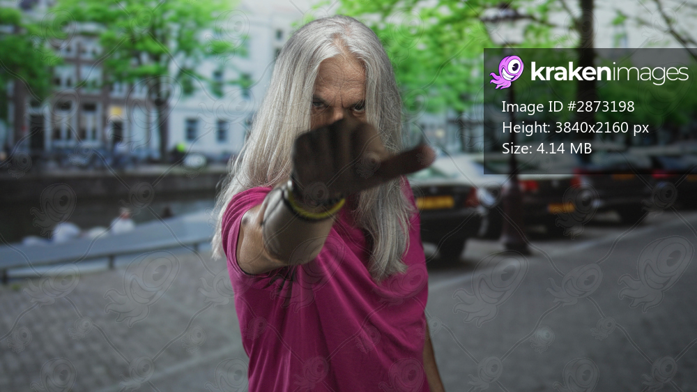 Man with long silver hair and beard reaches forward with an outstretched arm and hand on a cobbled street beside a canal in amsterdam; urban intensity. - Kraken Images